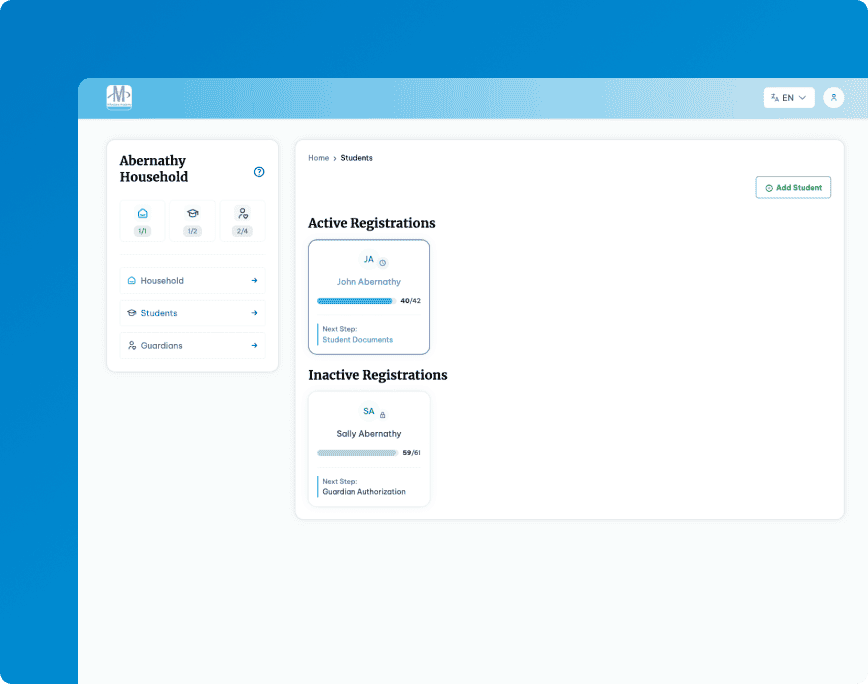 Never worry about parents getting lost in the registration process. Guided sections for households, guardians, and students make it easy to know what to do next.